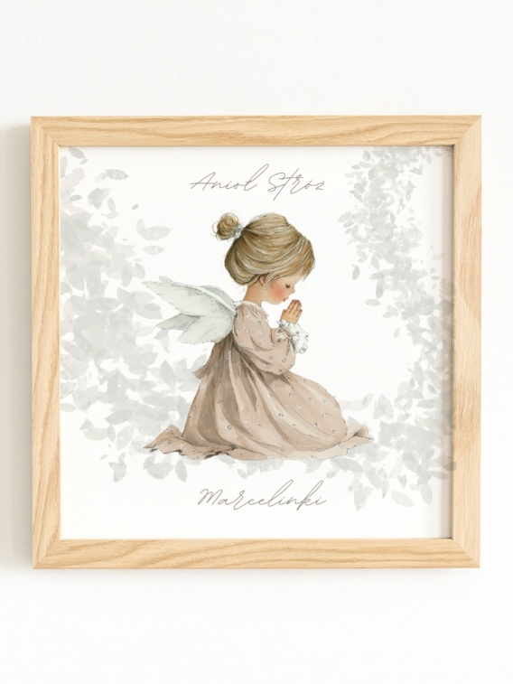 Pełna uroku romantyczna ilustracja z aniołkiem w kwadratowej sosnowej ramce, idealna jako pamiątka Chrztu Świętego dla dziewczynki, ale także prezent na narodziny