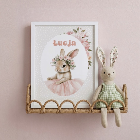 Uroczy plakat z króliczkiem dla dziewczynki z imieniem dziecka. Wyjątkowa dekoracja pełna delikatności i pastelowego uroku