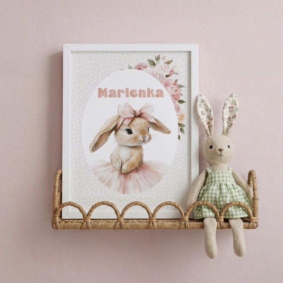 Uroczy plakat z króliczkiem dla dziewczynki z imieniem dziecka. Wyjątkowa dekoracja pełna delikatności i pastelowego uroku